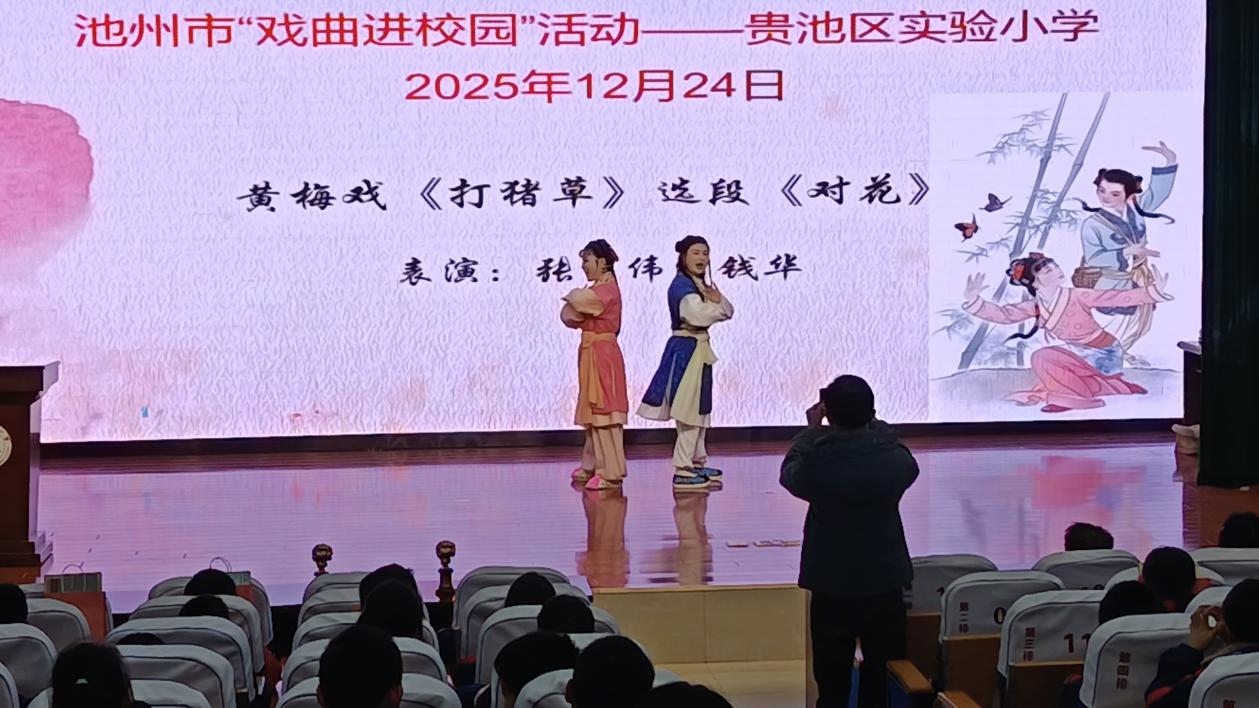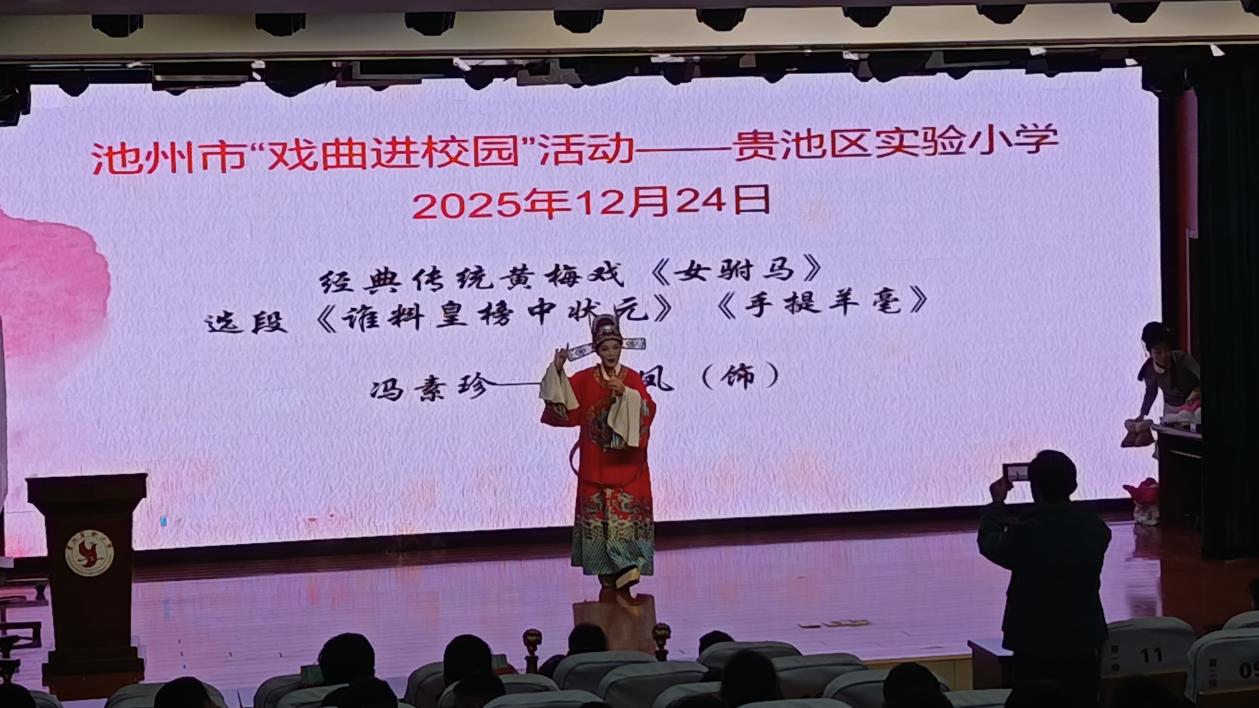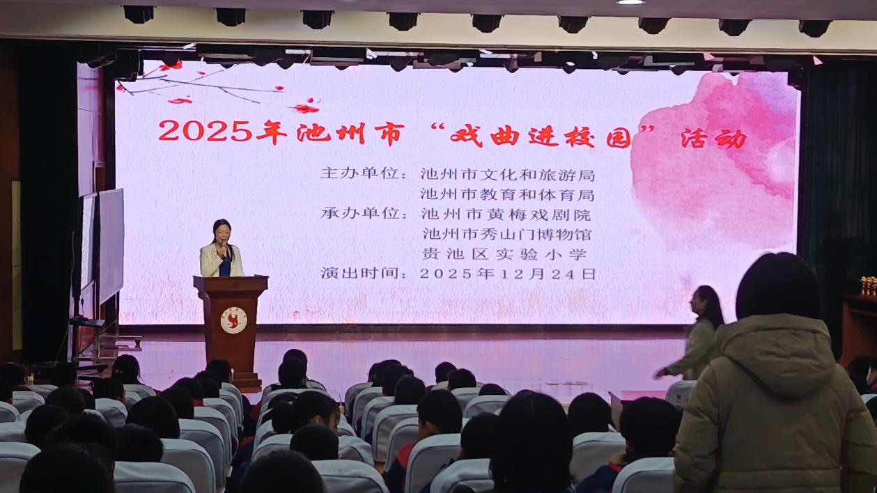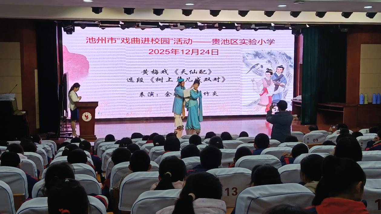 2025年12月24日下午,贵池区实验小学数字报告厅内掌声迭起,先是秀山门博物馆研学实践教育活动“研学之星”颁奖仪式圆满落幕,随后剧院带来的“戏曲进校园”活动接力登场,让传统文化在校园里完成了一场生动的传承接力。